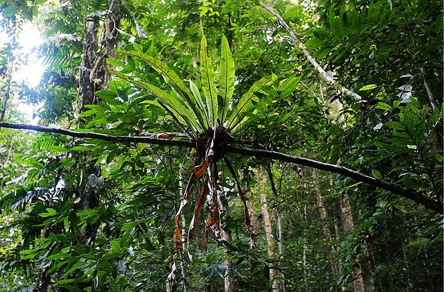 在小道中还能够遇到鸟巢蕨,这是一种爬上巨人肩膀的生命。在浓密的雨林中,阳光资源是稀缺的,只有站在高处,才能够吸收到更多的阳光。鸟巢蕨生长在高高的树干上或者有阳光洒下的藤条上,与普通的寄生植物不同,鸟巢蕨是自己从大自然中吸收养分。