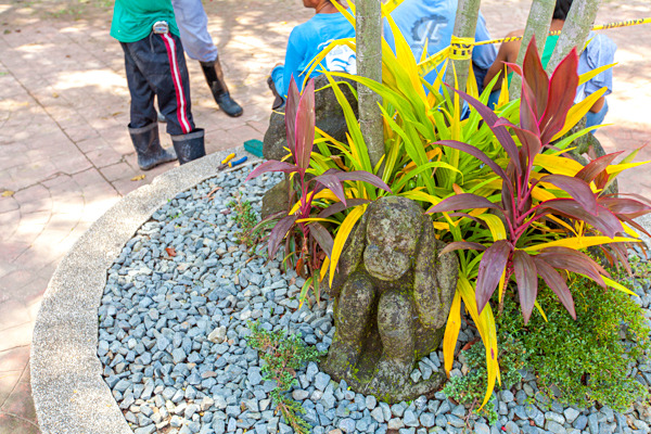 坐在地上的工人和小猴子石雕,在施工区外围长长过道边有几十个人物的头部雕像,没有仔细看估计都是菲国的“李四光”、“聂耳”们吧。