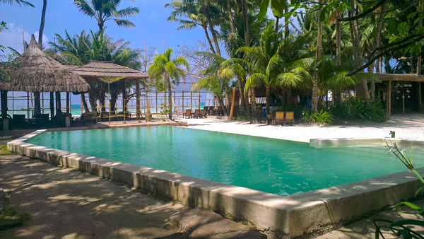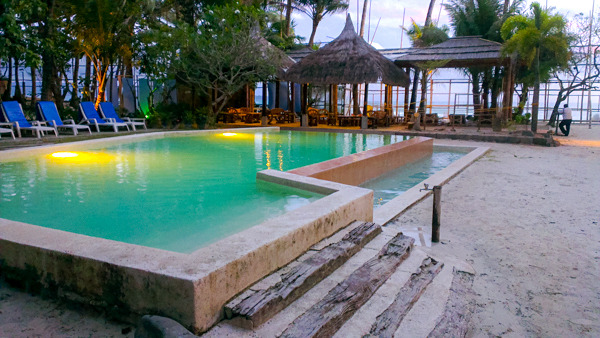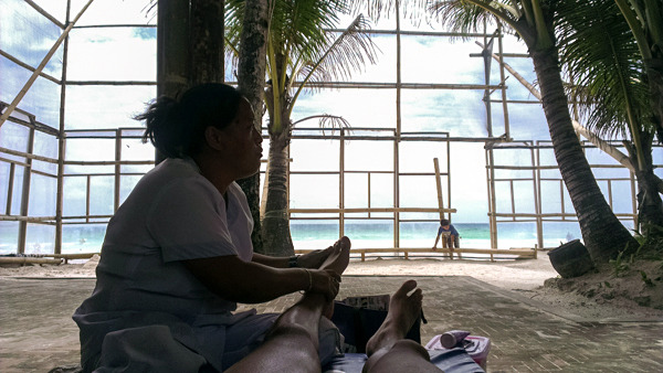 沙滩的泳池后来成为我经常光顾的部分,泳池旁的茅屋下有一排躺椅,适合massage的场所,再过去就是防沙用的一道竹竿、玻璃和塑料组成的高墙。