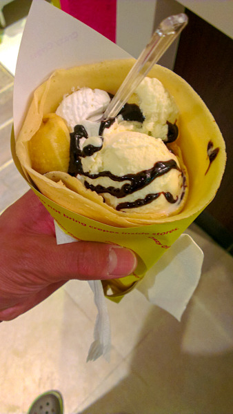 在长滩这边一个人一顿饭要想吃好点,合RMB就要100多,毕竟是旅游地区,饭后点了一个Crazy啥的蛋卷冰淇淋,Banana-Choco-Vanilla的,还算凑合。
