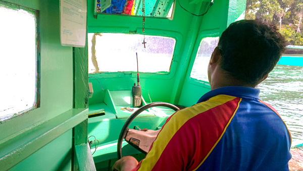 港口马上买票就上了螃蟹船,这种船两侧竹竿搭成很大的架子,形似螃蟹,主要是为了浮在海面上保持平稳,事实证明确实比来时的快艇稳,而且上船就客满开走了,全船都是当地人,我还以为坐错了。