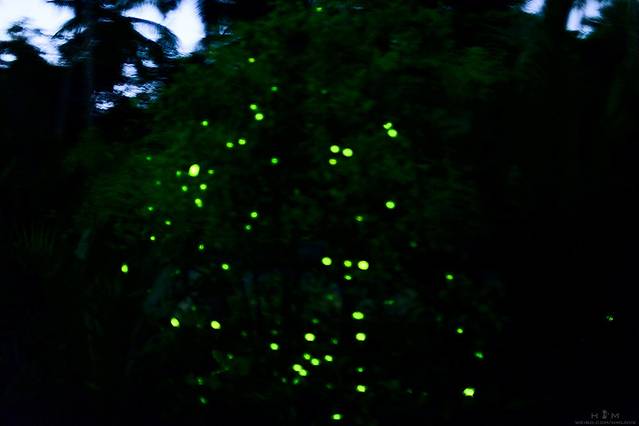 船开出好远,两边渐渐没有密集的房屋商店,没有多少人造光线,河道变得非常宽敞,两边的树低低的垂到水里,船夫慢慢的将船往其中一边靠近,指引着我们看向树林,突然,一小簇零零散散的亮光进入了视线,整个船上的妹子们都激动了,大家都一个劲的嚎起来。船越往里走,河边的萤火虫就慢慢多起来,真的看到了满树都是小星星的感觉,语言无法描述当时心里的激动,之前有人质疑说这些萤火虫是假的,船上妹子用手捧水洒向树边,于是萤火虫们就飞了起来,船上的妹子们再次炸锅……
