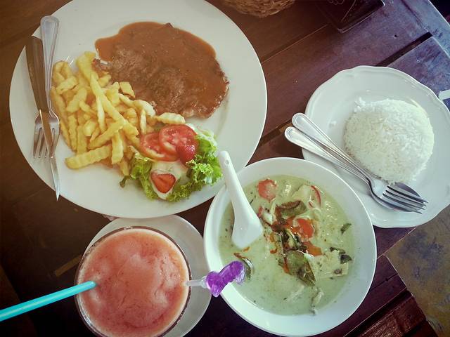 上午拍完一圈,也差不多累了,就直接回酒店休息吃中饭了。Mari PAI Resort的大门大厅左边就是餐厅,提供早餐中餐晚餐,右边就是前台。所以如果懒得到处跑,可以直接来酒店餐厅吃饭,价位相比步行街上面的小店也就贵几块钱,味道不错,我对泰国的味道接受度非常高,除了萨拉类(实在无法接受不涂沙拉酱的沙拉)。