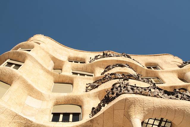 高迪的最后一个作品,米拉之家,当时的富豪米拉先生请高迪为他和妻子设计一幢外形奇特公寓。高迪非常热爱大海,把海底的世界搬到了地上,他以波浪形的外形冲击着我们的视线,窗户的栏杆以海带为设计,使这房子更加生动。从大门的玻璃门看过去,那泛蓝泛紫的墙面犹如在深海底一样。不规则的墙面和平台戴头盔的士兵造型的烟囱是它最著名的标志。很可惜的由于现在处于维修期间,停掉了所有的访问。