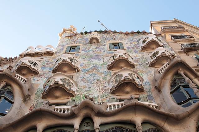 离米拉之家不远处,又有高迪的另一作品,巴特罗之家,外墙装贴着彩色的马赛克,屋顶的样子酷似龙鳞,处处充满了魔幻色彩。呈现在我们眼前的却是带有魔幻色彩的公寓。构思独特的凉台就像一个个面具。对高迪建筑的突出印象是它的雕塑性,铁艺的凉台、石头的窗框、膝盖骨一样支撑的柱子,都像是被高迪灵巧的双手,跟捏泥巴似地捏出来的。