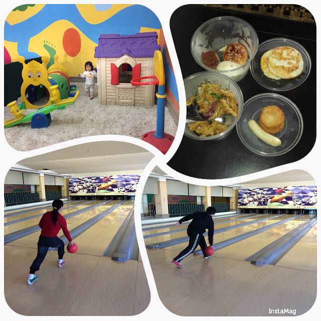 早上我和萌琪琪足足睡了个大懒觉,9点半才起,琪琪爸怕早餐亏了,楞是8点半爬起来去吃早饭了,从早饭上来讲,酒店还是很人性化的,双人早餐来了一位的话,它可以提供免费餐盒打包回去,以免饿着另一位贵宾😝,于是从带回的早餐不难看出,早饭也是好好吃的,我们三口又吃了个酒足饭饱,洗个澡再收拾行李,基本上就12点了。退了房直奔球类娱乐馆玩了会保龄球,娱乐馆里也是有小孩子的乐园天地,之所以选择保龄球是因为可以俩人轮着玩,轮着看孩子,如果是乒乓球的话,其实孩子的乐园天地就在乒乓球旁边,也可以一边看孩子一边打球的,但是保龄球的性价比高啊,你懂的😝。
