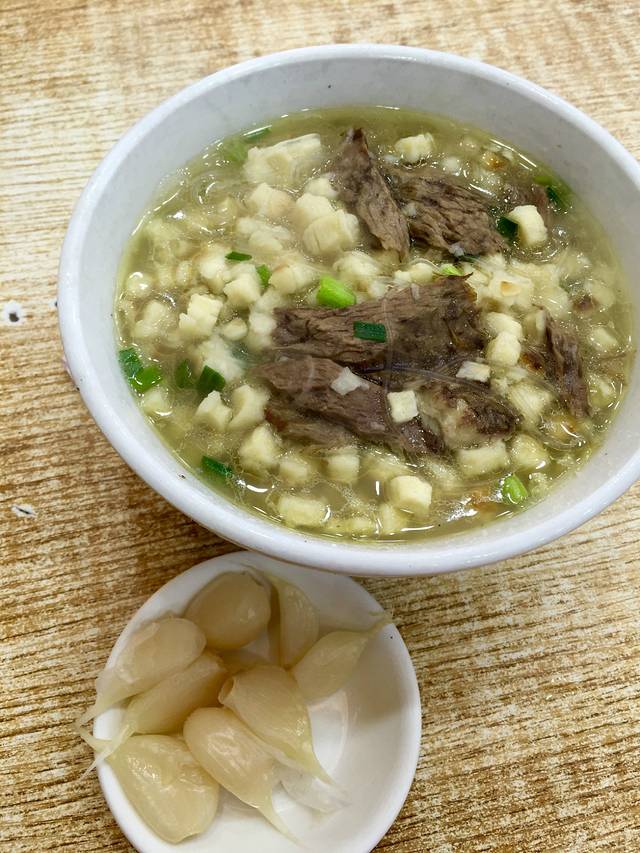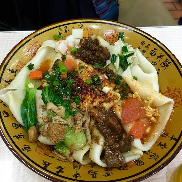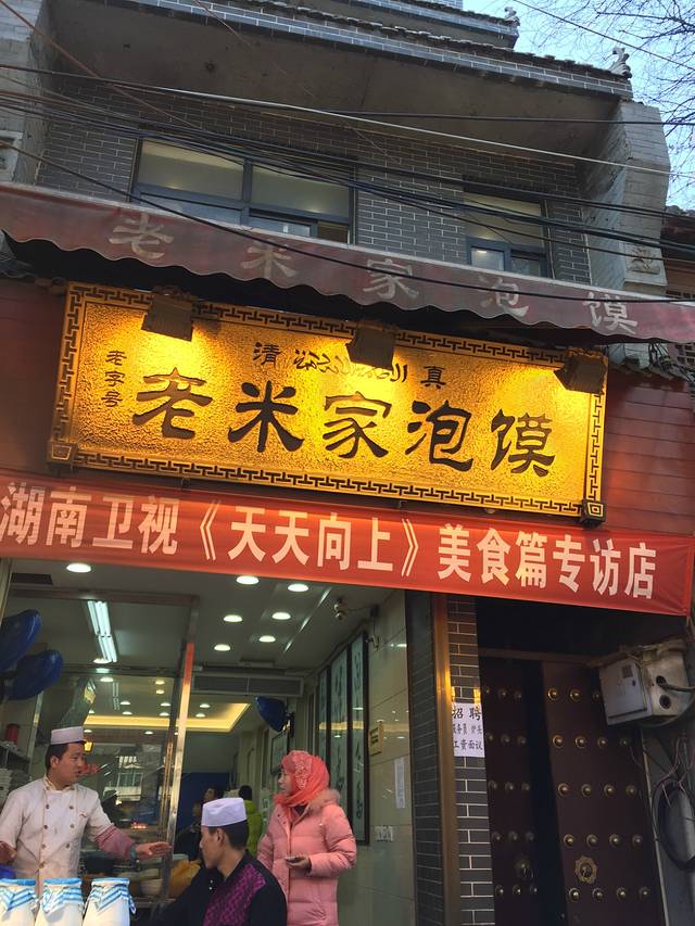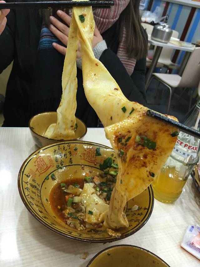 之前也没吃过,也不知道怎么的味道算正宗,看完皮影往回走经过,看到“天天向上专访”这么醒目的横幅,就进去吃了午饭。要的牛肉泡馍,它的汤汁和平常吃的兰州拉面的汤是一个味道。馍也没有让我们自己手掰,端上来就是一碗现成的。所以没有体验把馍掰成一小块一小块的过程。