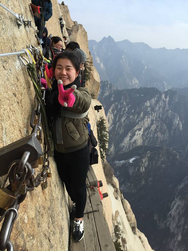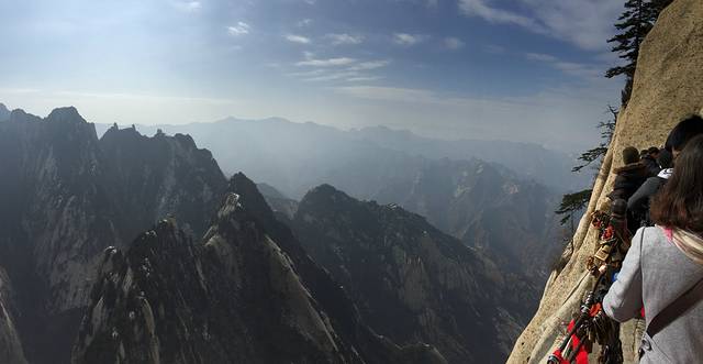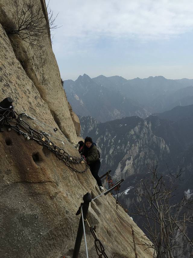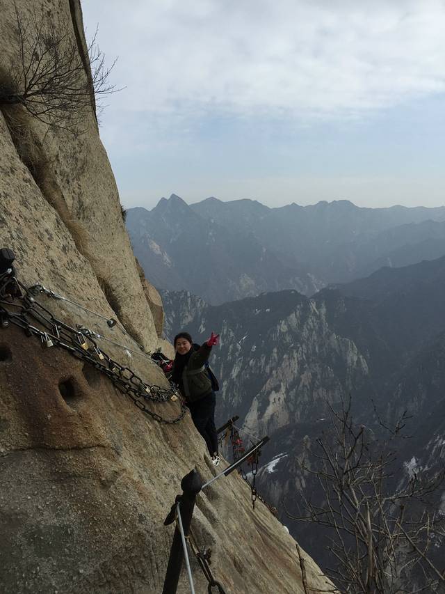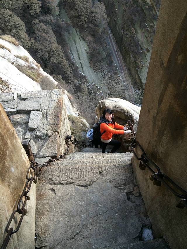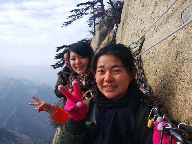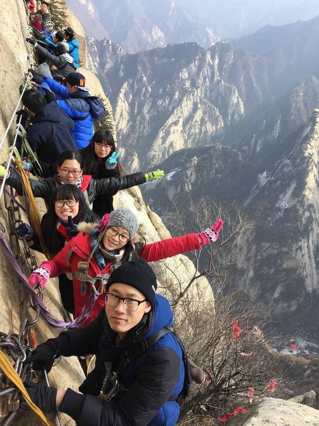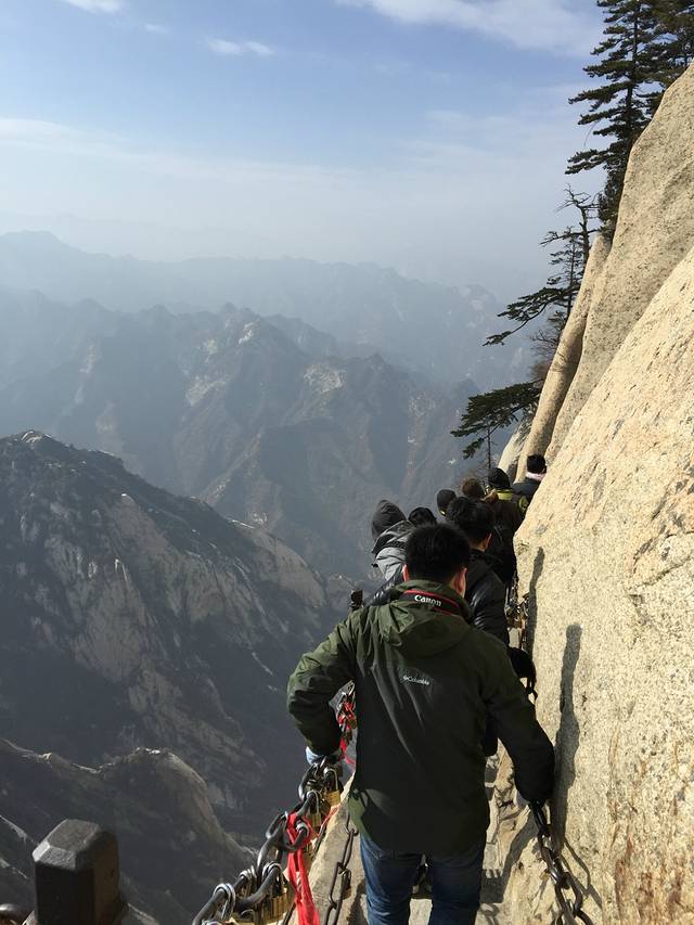 华山之行,我最最期待的就是去走长空栈道,或者说,就是为了它而去的华山,据说是国内最恐怖的一个栈道。它在华山南峰的东山腰上,木板搭建的栈道和嵌在悬崖上的铁链,每个体验者,花30块钱租一个安全绳就可以去享受这惊险的时刻啦~走完之后,整个人神清气爽,我迫不及待地想要去尝试张家界的天门山鬼谷玻璃栈道啦。