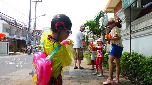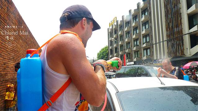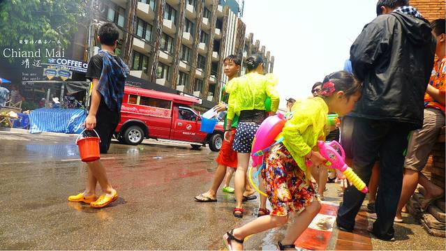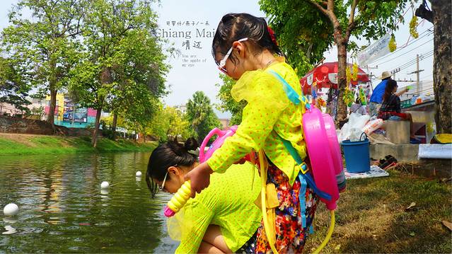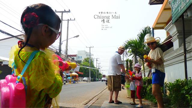 又叫宋干节,是泰国最大的节日,也是他们的新年,当然还有一个我很想玩的节日,水灯节,清迈和曼谷的考山路是泼水节的最高潮和最嗨的地方,为什么呢,因为清迈古城四周是护城河,泼水节一早这里的人们会把护城河的水灌的满满,所以护城河是泼水节最激烈的地方,但你想在古城里也可以,因为家家户户在门口都会准备好他们的水桶,你们不怕水枪里会没有水,但只有去参加了才知道,最激烈的地方不一定是最好玩的,我和女儿,媳妇倒是喜欢在古城里面巷战,时不时的一阿姨或小孩,从家里,或墙角阴暗处给你一桶,不要小看这桶水,有时候可是冰水,结果是会让你透心的凉,但护城河到了下午和傍晚时分那是人挤人,就象主场的大部队打战打成一锅粥,所以我更喜欢在古城小巷里,或在我接下来大后天清迈到PAI130多公里,车人都开的很热时,经过村庄,会有小孩和村里的人们,不经意给你一桶水让你大叫,"我讨厌泼水节,我还会回来滴"这成了我女儿最后喊的口号,但一定要注意安全,骑摩托车你可以叫坐后面的伙伴举起双手,来争取泼水者的宽大处理,还有要有献身精身,就慢慢开过去,让他们泼,不要开着车一闪而过,太危险了,我们一出门就见门口一小孩子泼一摩托车女士,啪,车,人,都趴地上了,所以安全第一,大不了被泼后,大叫尖叫逛吼几声,不要躲避, 没开车的人也一样,在街上不要因为冰水而跑,万一有车危险,没什么大不了的,给他们泼,爽和不爽都喊出来.