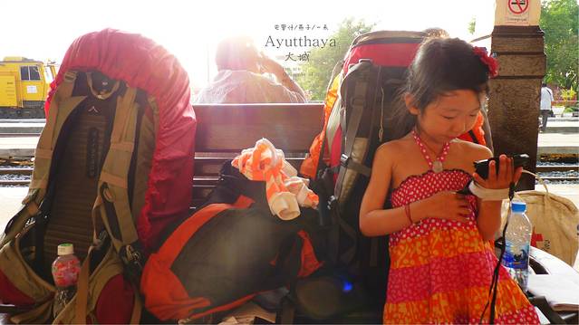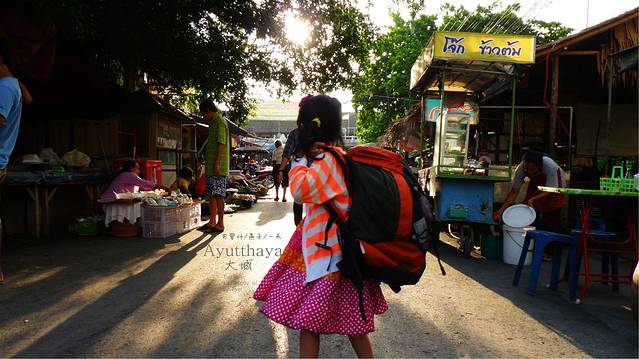 洗漱完毕,我们背起行礼,女儿今天也背了一个背包,因为骑行清迈到PAI我们理出了一个包,现给女儿背,按我们的计划,我们要穿过火车站前 面的街道到对面小巷子尽头坐河边坐船到Ayutthaya古城。