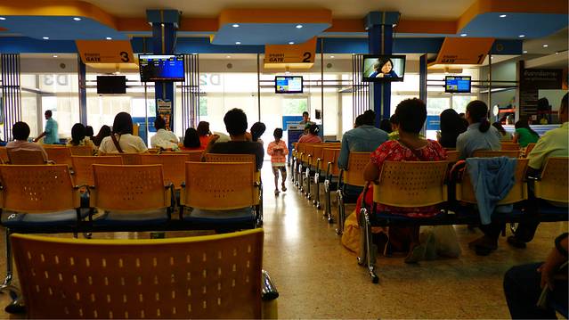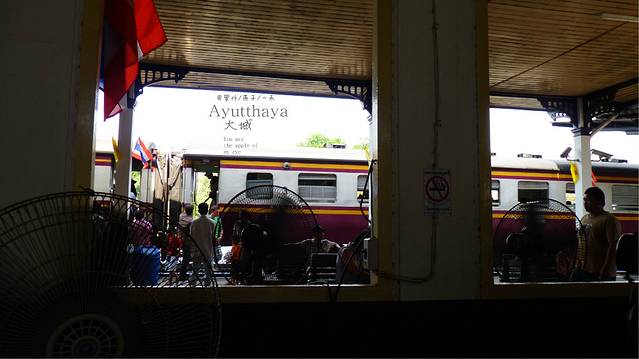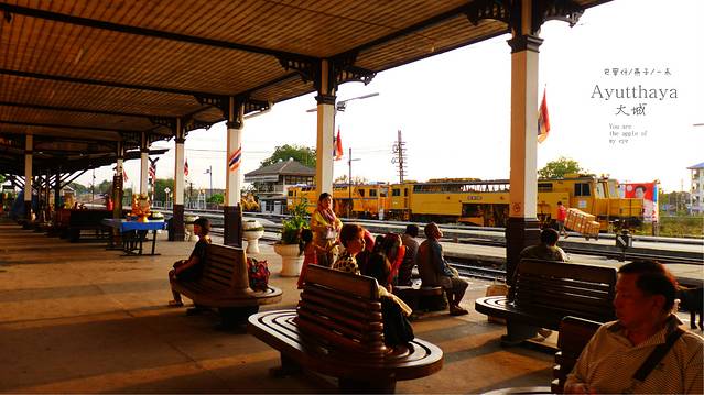 渡过河,穿过小巷,小巷的对面就是大城火车站了,找个有大风扇的位置坐下,买好火车票,然后在他们的员工洗漱室,拉屎,洗漱一番,回到坐位买几瓶饮料坐着等火车,媳妇去问售票员我们的火车还有多久到,他的回答是1个多小时,那好吧,我们就在候车室的椅子上整理下我们的背包 ,
