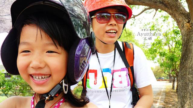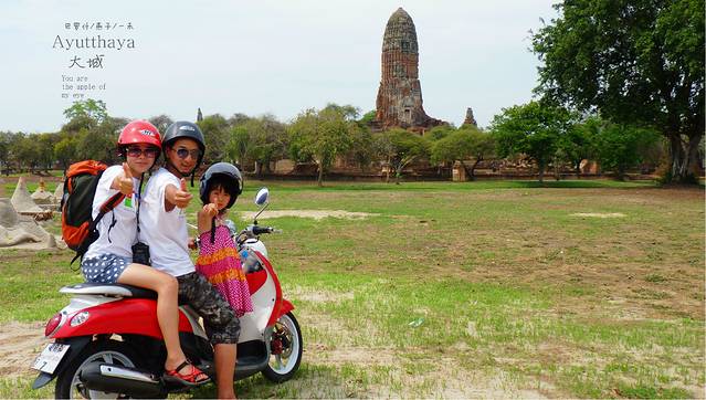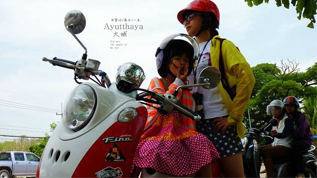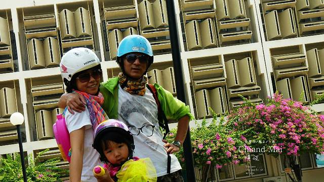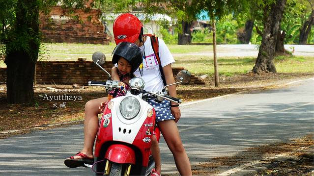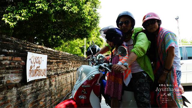 找了三条街,终于找到一条街有好几家店都是租摩托车的,货比三家后在一家老人家开的店里以200b拿下了一辆时尚但动力一般的摩托车,在城里开用不着动力太好.再说我们三人又不重,媳妇的护照压她们家,三条防晒衣有点汗臭,媳妇到她们家楼上洗了一下,选好头盔,两个背包放寄存他们这里,没收我们费用,我为什么一直说没收费呢,因为在曼谷华兰蓬火车站两个背包寄存两天竞要了我们200b,首都就是牛,开始我们的大城之旅行了,