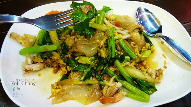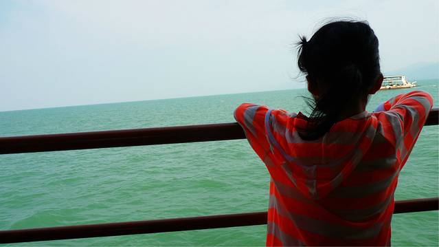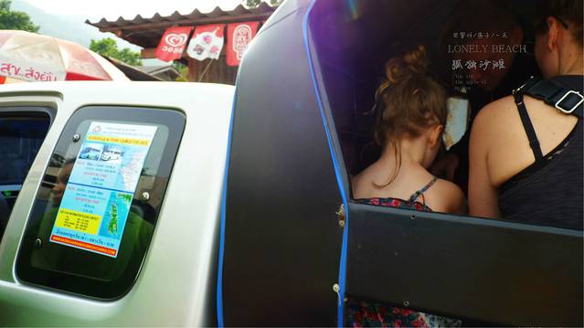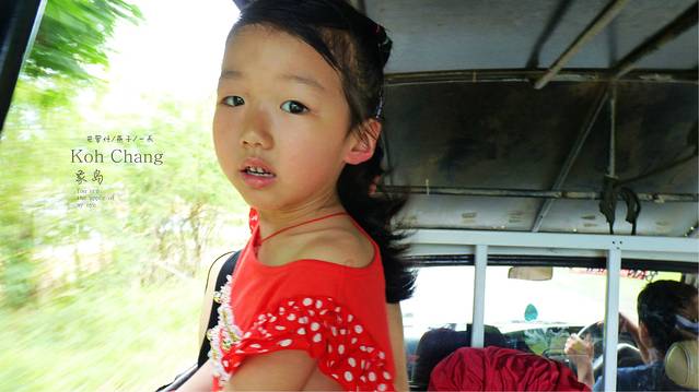 大巴车,车上全是金发碧眼的外国背包客,还好我们边上的前面有一对中国小夫妻,这算是我们这次旅程中碰到的第一对旅行伙伴吧,问他们去哪里,他们只知白沙滩 ,而我们是去孤独沙滩 ,在象岛的快接近最南了,大巴车中途停车吃饭,我们点了一个炒饭,三人吃一盤,味道不错,比magicfood是好吃多了,大巴车下午四点左右到达达叻府trat,为什么这么晚呢,因为车胎爆了,不过大家都是一脸休闲和放松的神情,仿佛传达给司机的信号就是你慢慢来,我们有的是时间,在修车店我们会集体下车坐一下,看看怎么修车,边上买个饮料,大家彼此都是佰生人,但都非常 礼貌相付点头,微笑,打招呼,我想这也是这次我女儿在路上学到的东西之一吧,当然平时她也是很有礼貌的,嘴很甜