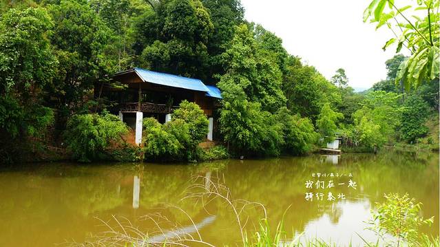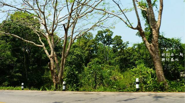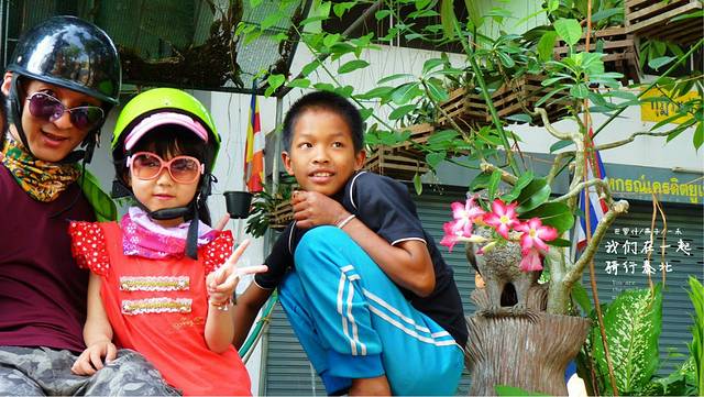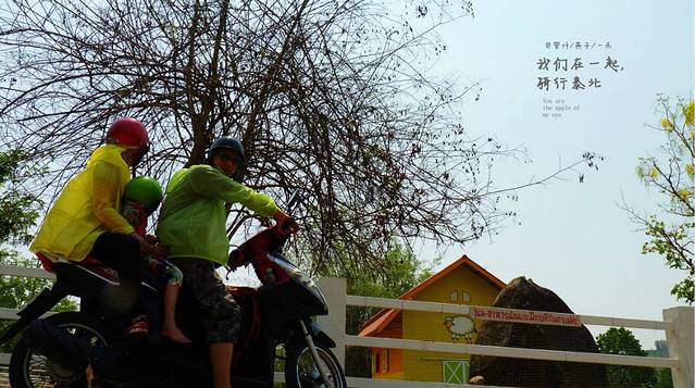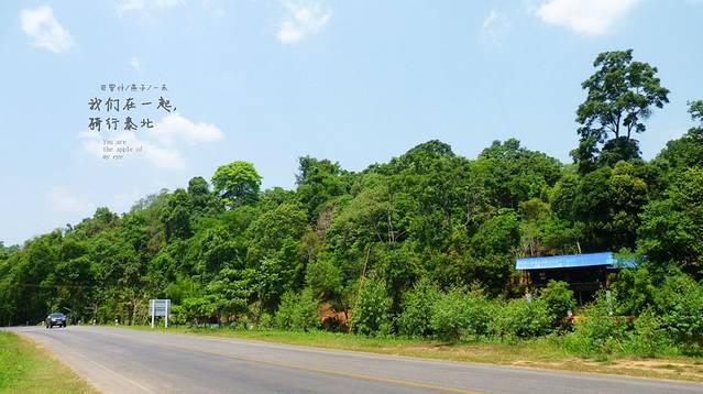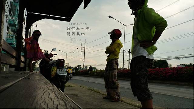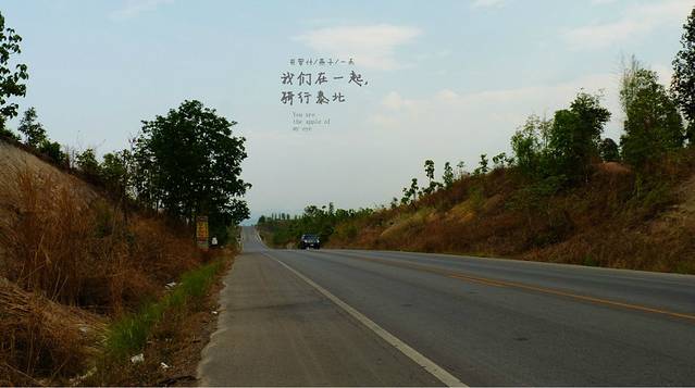 今天是4月17号下午,离清迈还有64公里,开了一大半了,在路牌边上停了下来,今天停下来休息比昨天要少,颈椎也没向昨天那样吃力,喝口水,扔下托鞋女儿也下来运动运动,不过没有象昨天那样出现三个疯子在路边跳舞的情况了,这里的边上是个小湖泊,风景优美,今天经过的村庄已经没有人拿水泼我们了,看来泼水节是真的结束了,我们朝着清迈进发,