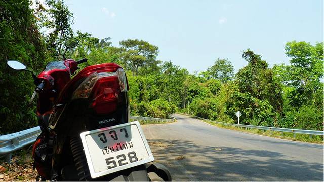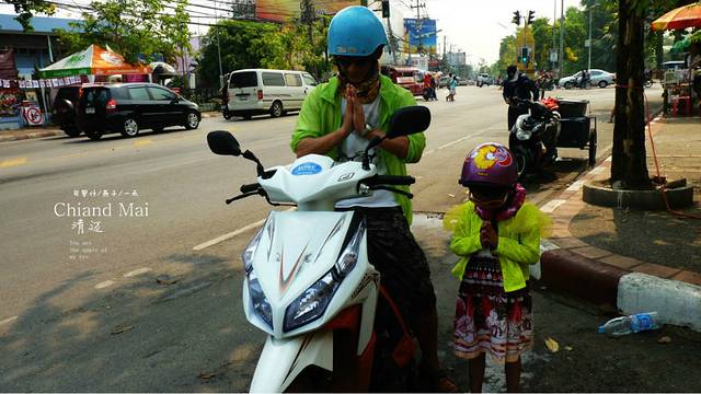 左行的路,在古城绕了一圈,我们冲出北门,我们把自已从头到脚包的满满,一路向北,伴着耳边的风声,我们开始130公里700个弯道的骑行,我们才刚开出古城不久,边上有警察,也开着摩托,穿着他们的紧身制服,他是去上班吗,和我飙车呀,好,来吧,拉动油门,.十字路口,红灯,我们一起停了下来,他朝我们笑了一下,打了个招乎,我们也笑了一下,女儿和媳妇向他 "萨瓦迪卡", 再向前50米警察拐弯了,我想他是去上班吧,泰国的警察我印象很好,很亲民,特别是这紧身制服,我们祖国的人民警察很多就不敢穿,因为他们皇粮吃的太好,运动的太少,一身肥肉和肚子的太多,其实不管泰国,还日本,还是别的国家,好东西我们就应该学.开了30来分钟,媳妇看到路上有个西瓜摊,我们下来买了半个西瓜,一会儿配饭