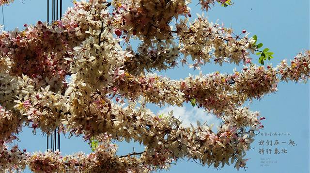 摇摇洁白的树枝,花雨满天飞扬,落在妈妈头上,飘在纺车上。给我幸福的故乡..........风一吹花瓣象雪花一样飘落,自已都觉得在这棵花下面感觉就是在电影的情节里,太浪漫了