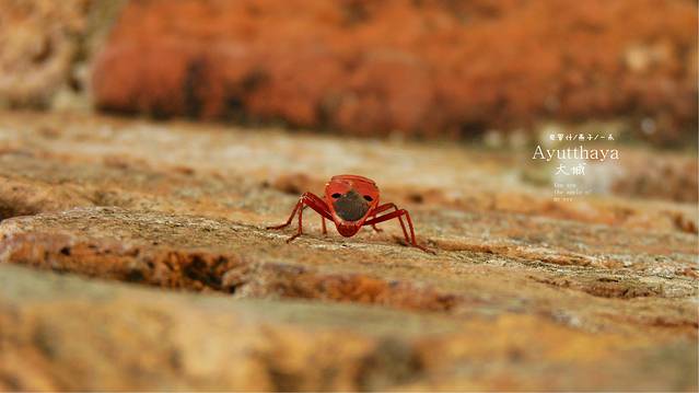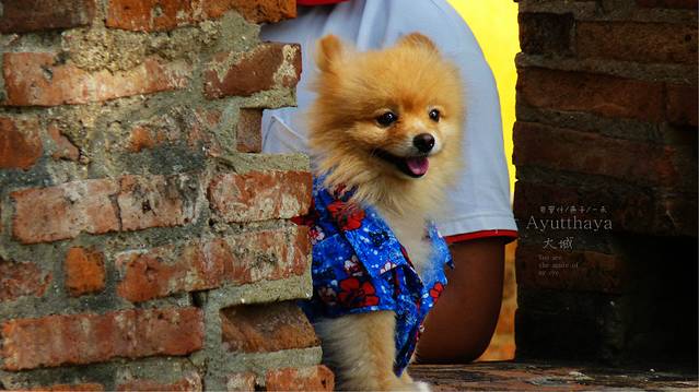 边上一个游客的小狗狗,在这么古老的红砖墙上,穿着这着泰国式的衣服颜色,很是可爱,大城好象有很多的野狗,在一些遗址里或塔上,游客禁址上去,而它们却时常让我们看见在里面或上面游荡.