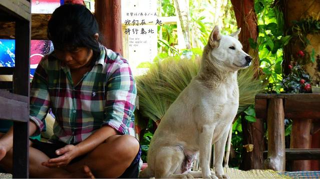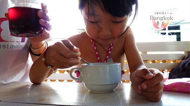 终于找到了一个能喝水,和能坐一下的歇会儿的小店,停好车,拖鞋脱门口,里面是一个老大娘和一条大白狗,女儿一向怕狗,在狗面前她特别小鸟依人,我们要了两瓶红牛,20B,人民币2块钱一瓶吧,坐在这里拿出虾片,老大娘问小孩几岁了,我数着手指one, two three, four, five,5岁