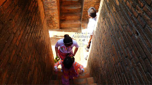 个人认为柴瓦塔那兰寺是大城最宏伟的建筑群,它坐落于Chao phraya 河西岸,是16世纪时国王prasat thong为纪念母亲而兴建的,此庙高棉式风格,象小吴哥窟,我们开着摩托开过地图上西南边的大桥往左,很快就到了柴瓦塔那兰寺,跨过尼龙丝拉起来的围墙,嘿嘿,没收门票,本来这次我准备了500B大城的门票费看来可以省啦,和女儿,媳妇在里面你追我赶,因为太阳太烈,我们的游戏就是从这里阴暗处跑到那边的阴暗处,大概是我们的尖叫和笑声太过招摇,招来了这里的保安,要我们去门口买门票的,保安就是负责跨过尼龙丝拉起来的围墙的人们,但也太简朴了吧,用尼龙丝拉起来,我们一跨就过了,唉,在门口买了两张门票100b,50B一张噢