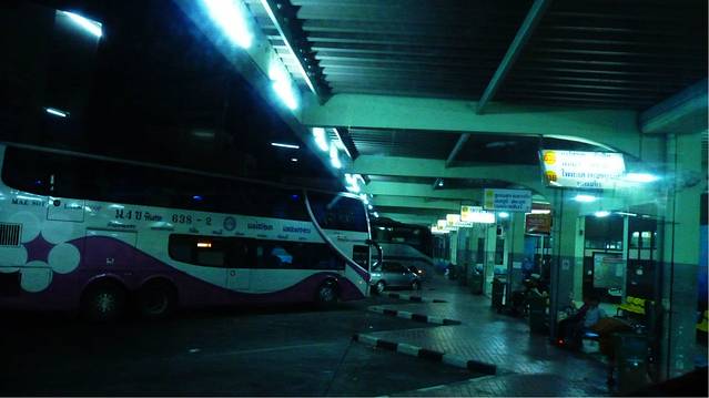 我们拿回我们的背包,还回摩托车,并要求老板给我们一个钟点房,我们想洗了澡,理了背包,再去阿卡车站,这里的老板真的很好,摩托车开起来不是有点叭叭响吗,老板说没事,而且把我们带到他们的员工宿舍,我们洗了澡,理好了包,没收费,还帮我们叫了TUTU,100B,而且我们的背包放他这里两天了也没收我们钱,太贴心了,在国内的一些窝心的事,想想有时太破坏旅行的气份了,告别老板,我们坐上TUTU,这辆TUTU很有特色,司机我们也认不出是男是女,开着泰国的歌曲,我们一路指向阿卡车站,在阿卡车站我们碰到了象岛到清迈的那三个同伴,看来那天他们买了和我们同一个窗口的车票,但是他们是去曼谷,想去美功呀看看,而我们要在半路司机把我们扔下大城,这车还不错,但当然不能和NCA比,早就知泰国的长途车开冷气狠,我们还特地带了一个抓绒睡袋,可一直没用上,可今天这个晚上用上了,而且三个人抱在一起,俺还是冻坏了,妈的开冷气不要钱吗,车上开着淡蓝色的淡淡灯光,我们一群车里的人仿佛象冷冻室里的一群猪,好象不冻就不新鲜是吧,娘的,冻死我了,加了两条毯一个抓绒睡袋.