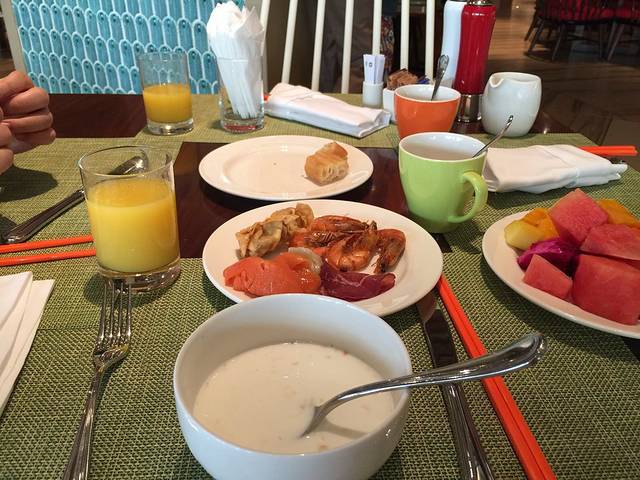 但是晚餐!真的太坑了!坑到我们游完泳,看到池边餐厅热舞的揽客活动,看着热闹的人流,便进了康德提?餐厅。没问自助多少钱一位,因为看着菜品内容我以为是免费提供晚餐…因为只有四个正经热肉菜,而且一秒被抢光便不再补,没有主食,只有炒饭能勉强当主食,其他什么饼之类的6种,6种素菜沙拉,2种玉米粒大小的生鲜沙拉。6种左右甜品每块超级小。一只烤乳猪所有人分,4种水果。没有酒水!这竟是自助餐的全部…吃完服务员拿账单来签,看到2个人500多的价格后,我差点把刚吃的炒饭吐出来!!!!!老娘只吃了烤猪的几块肉!其他所谓肉,毛都不见!没有果汁没有饮料,没有主食!连个热菜都秒完不再上!说白了我花了200块吃了一个素食沙拉?哈哈哈真是…吃过那么多家5星级的自助,更贵的有,但是值,这自助39块都不值!