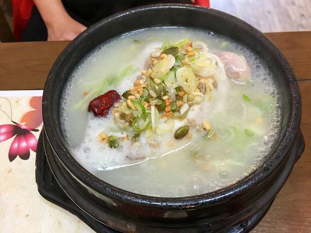 参鸡汤用一整只小鸡外加大枣、板栗、枸杞、高丽参等配炖成,料营养丰富,肉炖得极烂,鸡肚里面填着满满的糯米,汲取鸡汤精华的糯米比鸡肉还好吃。据说参鸡汤对于女性,可以滋补、养生、美容、去燥,好处多多啊!