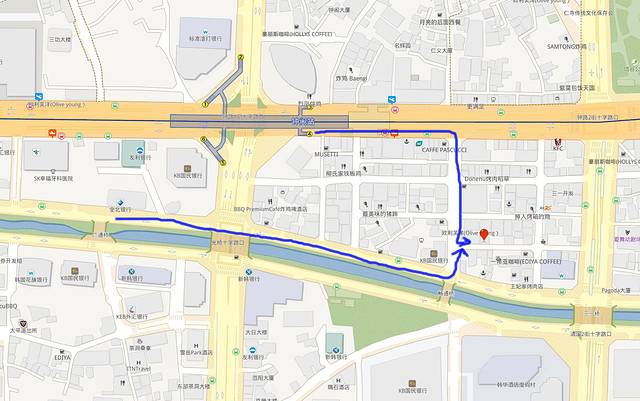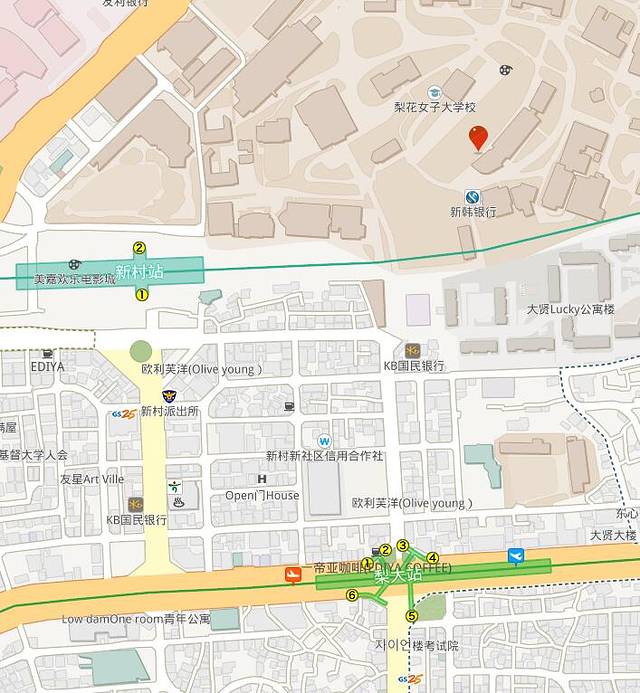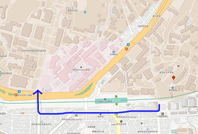 从梨大正门,沿着商业街向西,看到一座教堂,再向北穿过一座桥就到了