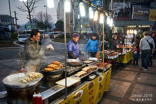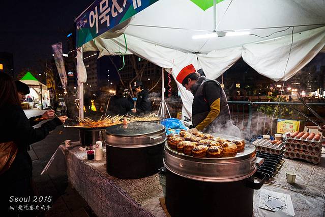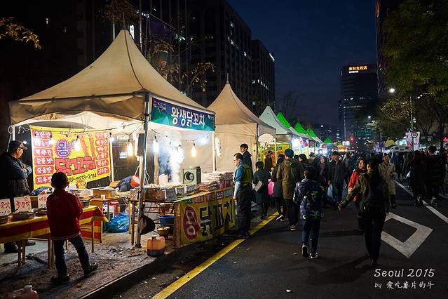 美丽的花灯吸引了众多的游客,当然也少不了美味的韩国料理来捧场。众多美味小吃摊把清溪川两岸马路边摆的满满当当,我们就这样一路欣赏着花灯,一路品尝韩国小吃。