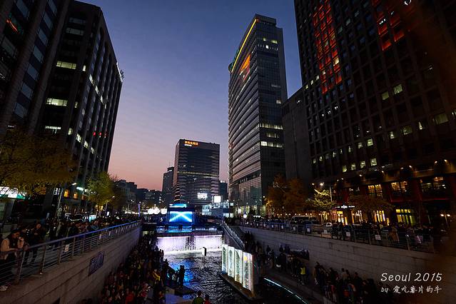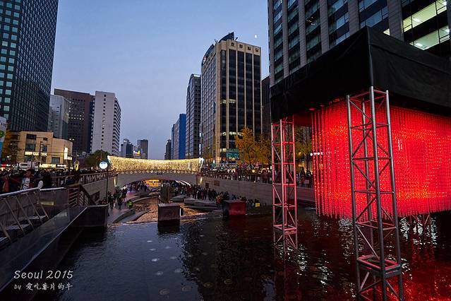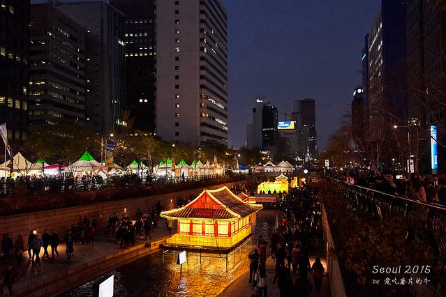 当我们离开光化门广场,走进清溪川,发现这里聚集了非常多的人,排着队参加什么活动,后来才知道我们非常幸运也很意外的赶上一年一度的“首尔灯节”,几百盏各式各样的彩灯沿河面一路排开,将清溪川装点得五彩斑斓、梦幻多姿。