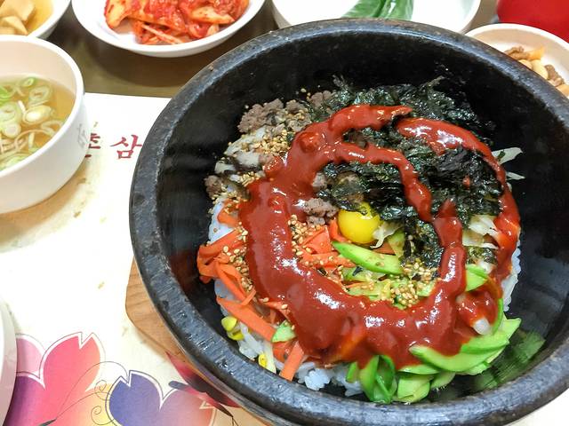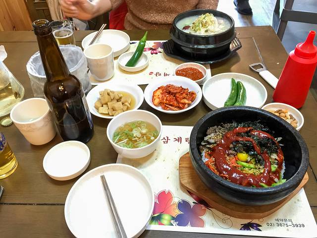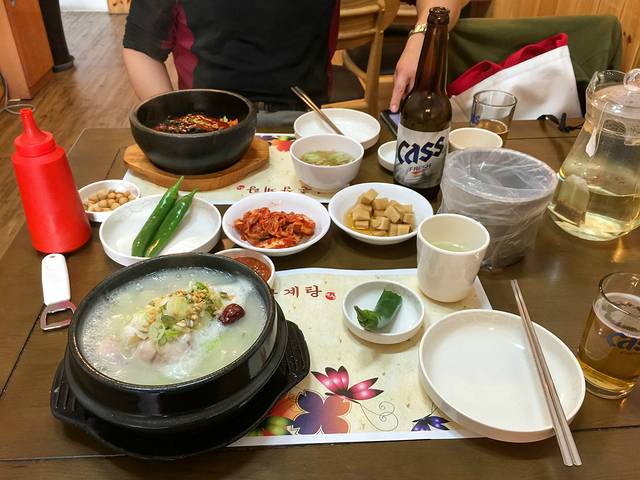逛完昌德秘苑已经下午一点多了,我们俩饥肠辘辘,看到路边有一家“北村参鸡汤”,果断进入。这是个二层小楼,虽然没有什么名气,但是店面干净,老板非常热情。我们俩点了一份参鸡汤(12000韩元)、一份石锅拌饭(8000韩元),还有一瓶店主特别推荐的CASS啤酒(4000韩元),还送了很多小菜。一共花费24000韩元,总的来说味道非常不错,值得推荐。