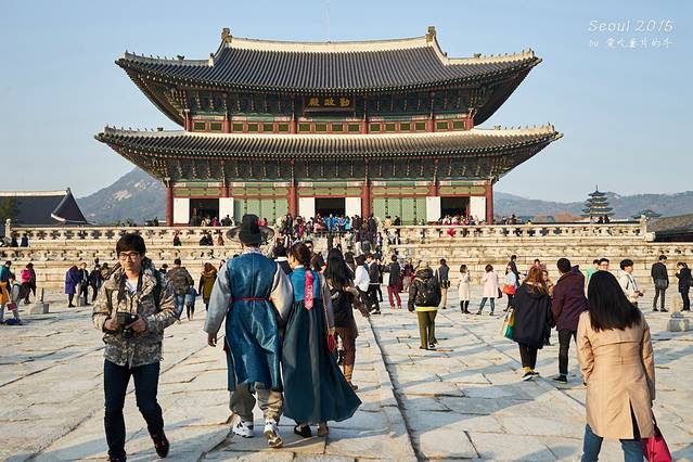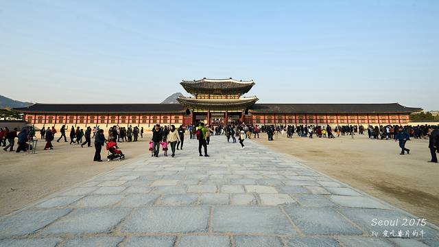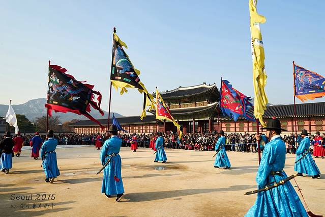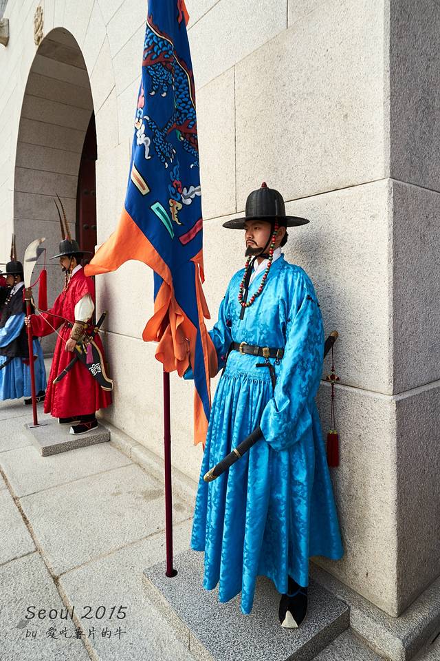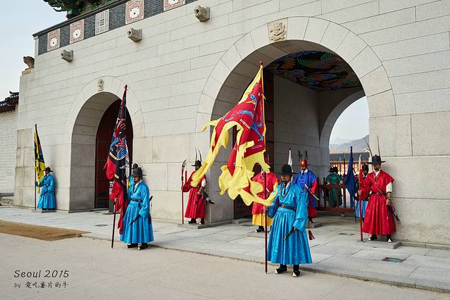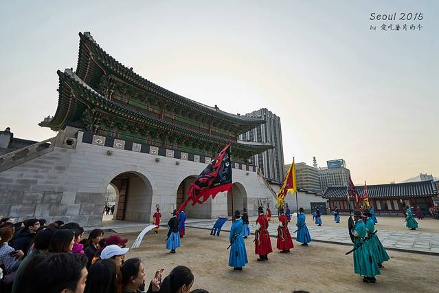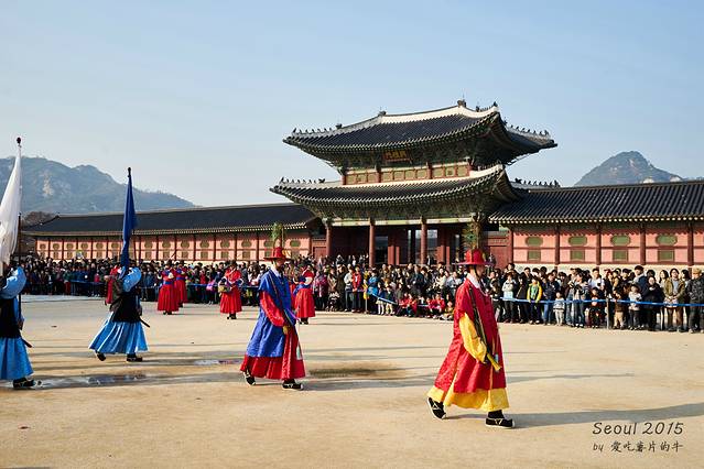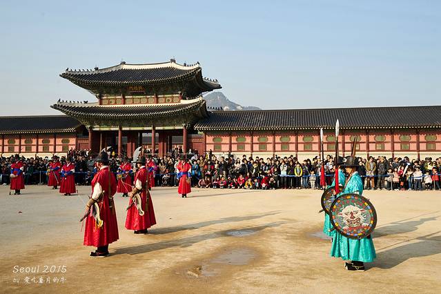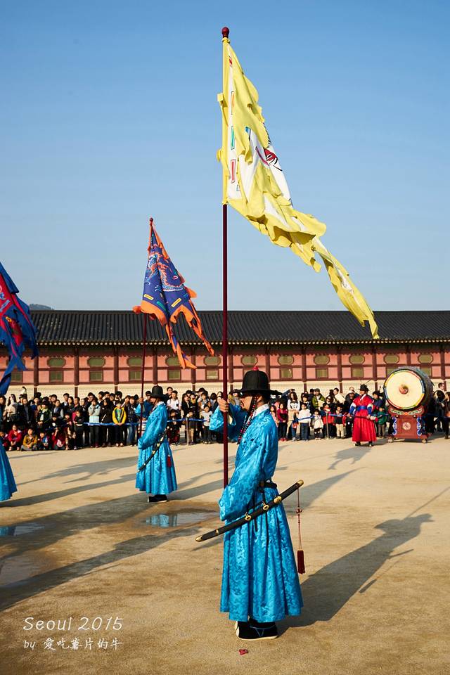 饱餐一顿之后已经是下午两点半,离景福宫最后一班换岗仪式时间不多了,于是我们俩开始一路狂奔,好在赶到景福宫兴礼门的时候仪式刚刚开始。一群手持长刀盾牌身着古代朝鲜服饰的卫兵,合着乐队鼓点,踏着整齐的步伐穿插行进,现场真是“彩旗飘扬,锣鼓喧天”,还是非常有看头的!