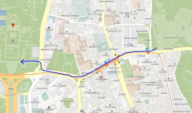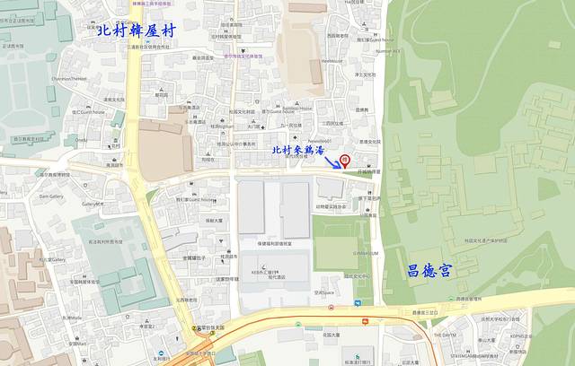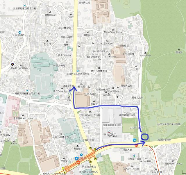 安国站3号出口向西走,圆圈处为昌德宫售票处,先预约秘苑参观时间,然后向西北参观北村韩屋村