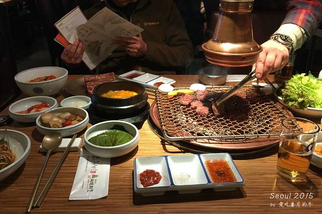 店里有中文菜单,还有中国服务员,所以不用担心点餐的问题。我们点了一个双人套餐(67000韩元)加一瓶啤酒(5000韩元),用了从网上下载的优惠券,打完折后一共65300韩元,大概是360元人民币。套餐里除了两份牛排烤肉还有一大堆的小菜,非常丰盛,而且不用自己动手,服务员会帮你烤肉哦