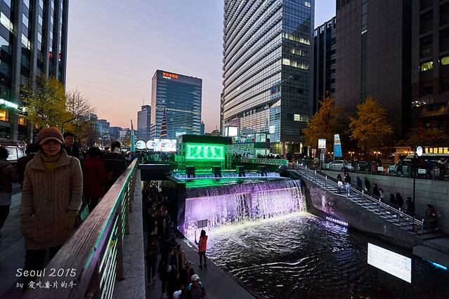 我们并没有跟着人流挤进清溪川的溪流,而是选择沿着路旁的河岸边走边看,远远的欣赏这美轮美奂的景观。