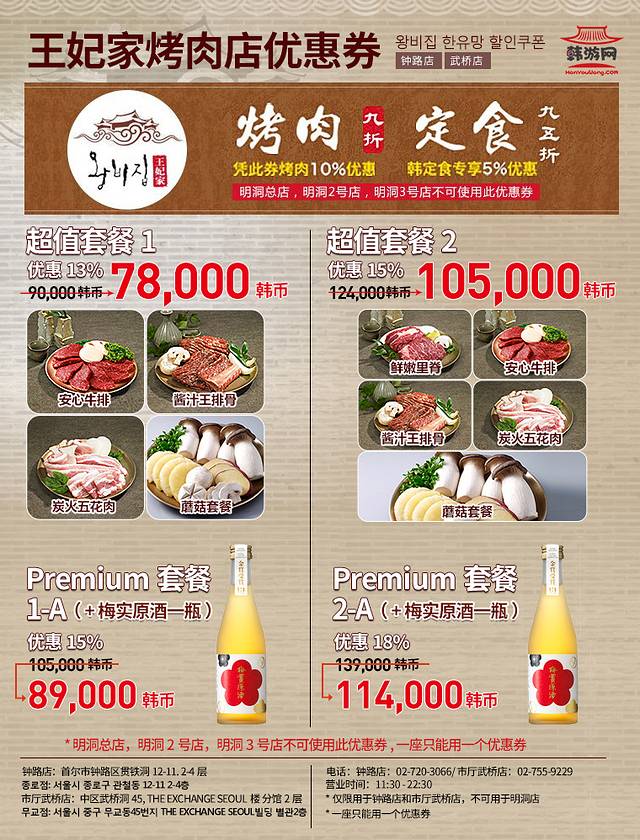 凭此券,在王妃家烤肉店钟路店或市厅武桥店用餐,“烤肉类”可享九折优惠、“定食类”可享9.5折优惠。超值套餐1(2~3人)优惠13% 优惠价78,000韩币,超值套餐2(3~4人)优惠15% 优惠价105,000韩币