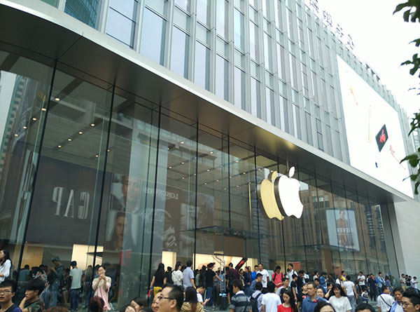 这是南京路的苹果旗舰店的外面的景象。我去里面看了一下。手里拿着iphone6s或者6splus抑或ipad air的结账的人从地下一层一直排到了地上一层。场面十分火爆。店里面水泄不通,难以通行外面也有好多人坐在台阶上。