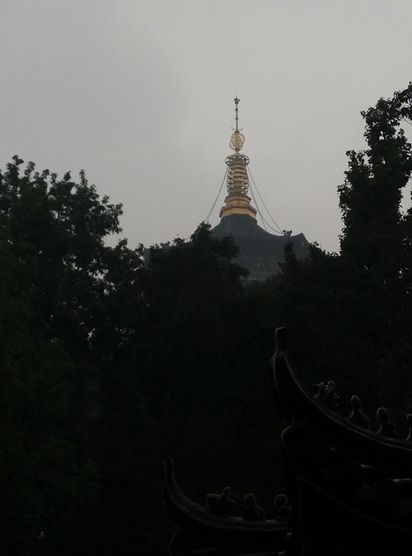 图片中间是雷峰塔,上面的金色的饰物闪闪发光,据说是由纯金打造的。右下角是三坛映月三座石塔中的一座。