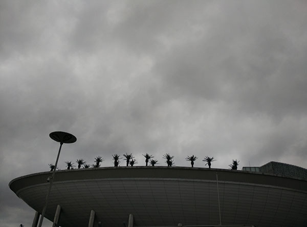 这是沙特馆,可能是仅存的外国场馆。展馆形似一艘高悬于空中的“月亮船”,在地面和屋顶栽种枣椰树,形成一个树影婆娑、沙漠风情浓郁的空中花园,令人着迷。