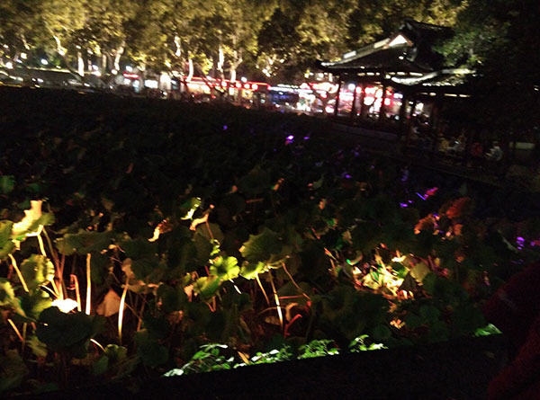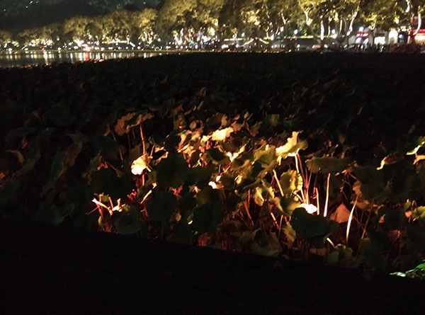断桥旁边是数不尽的荷叶,在湖水下以及桥边都有灯光照射在荷叶上。