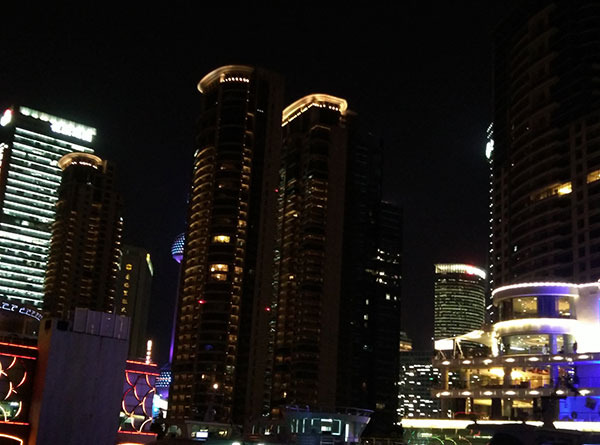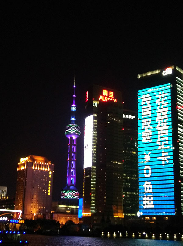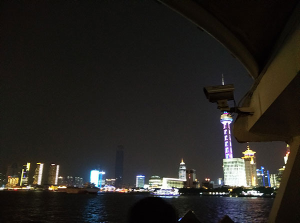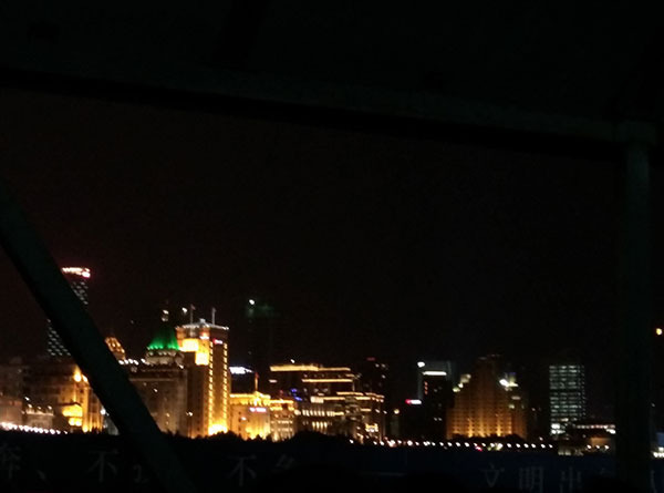 在轮渡上浦东浦西的景色一览无余。两侧灯火倒映在江面上,精彩异常。上海可以说得上是中国的不夜城。