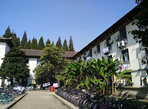 这是同济的男生宿舍,只有三层楼,感觉应该是旧时期的老建筑。其实透过窗子是可以看到里面的,但是不知道为什么没有人。