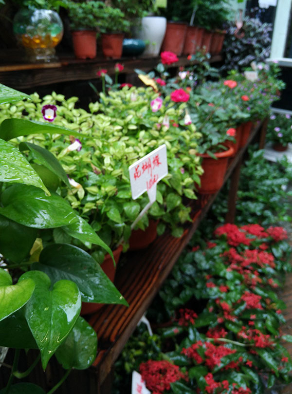 不知道在哪里发现了这一片幽静的去处,这里面摆放了各式各样的我没有见过的花草,上面都标注了价格。这些花草在十一的吵闹嘈杂的田子坊里面生机勃勃地开着,向游人们展示着她们的青春与活力。她们鲜艳地开在田子坊那有幽静味道的弄堂里,诉说着属于她们自己的故事。