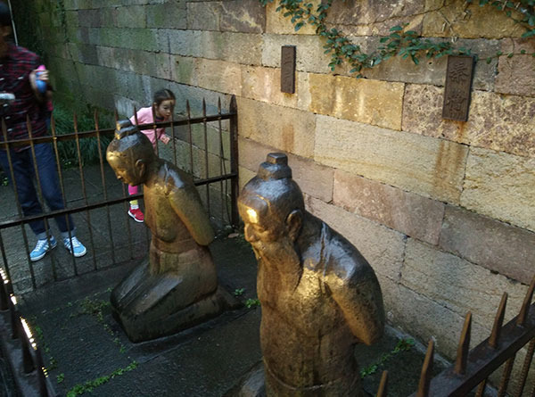 图为秦桧夫妻,很早之前就听说秦桧夫妻的跪像,他们跪在岳王墓前很远的地方。虽然有指示牌写着“请不要吐痰”,但是仍有很多人出于对其的愤恨不停地吐口水。