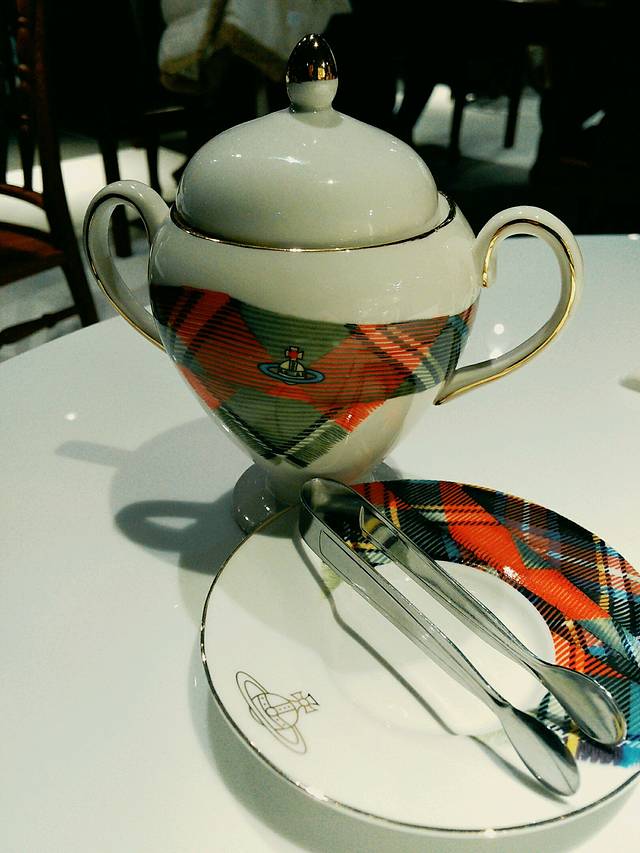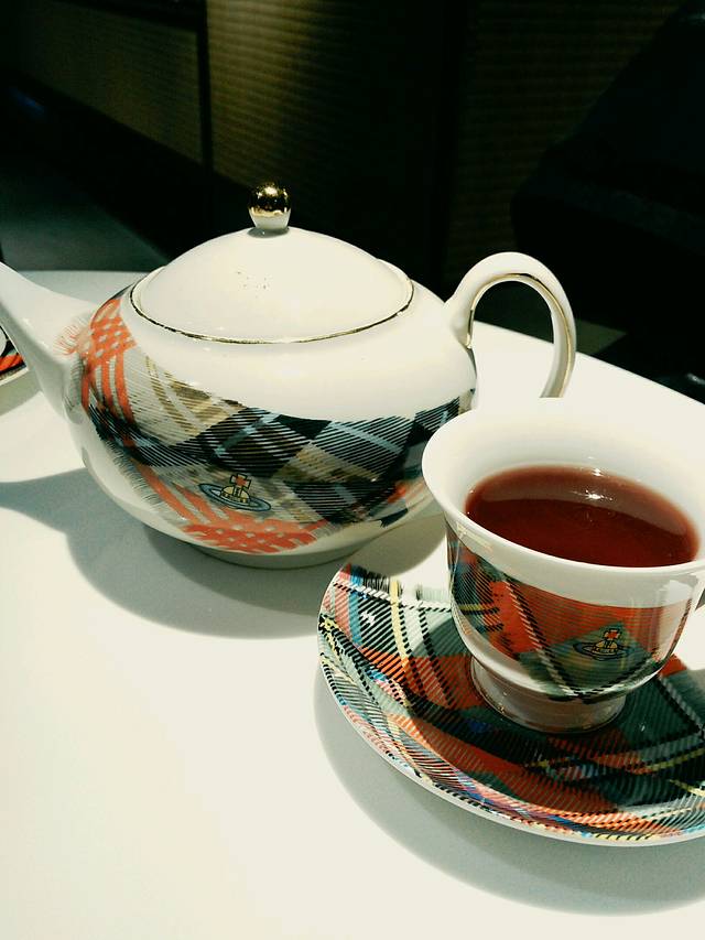虽然买不起,但是还是来朝拜一下。咖啡店就开在专卖店旁边,但是网上评价很差,我们就花了62点了壶野莓花茶来拍拍照装装逼。盘子茶壶都是西太后标志的格子。店里只要是女生的都在拍照(包括我们)。