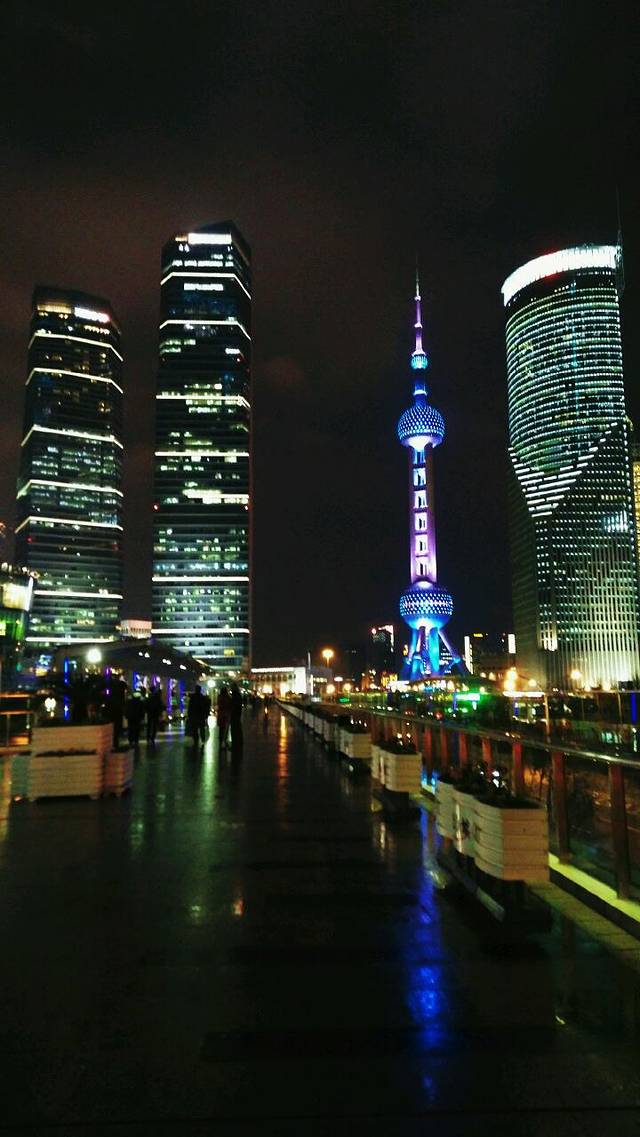 吃完饭散散步,上了天桥。沿路拍拍夜景,下午的时候还有大雾,三兄弟只能看到一半,到了晚上雾都散了,还有月亮。我在写攻略的时候才去查这个天桥叫什么,资料显示“二层步行连廊工程由“明珠环”“东方浮庭”“世纪天桥”“世纪连廊”四部分组成……通过它可到达新鸿基大厦、东方明珠、正大广场及陆家嘴轨交站,串起金茂大厦、环球金融中心等更多楼宇。”