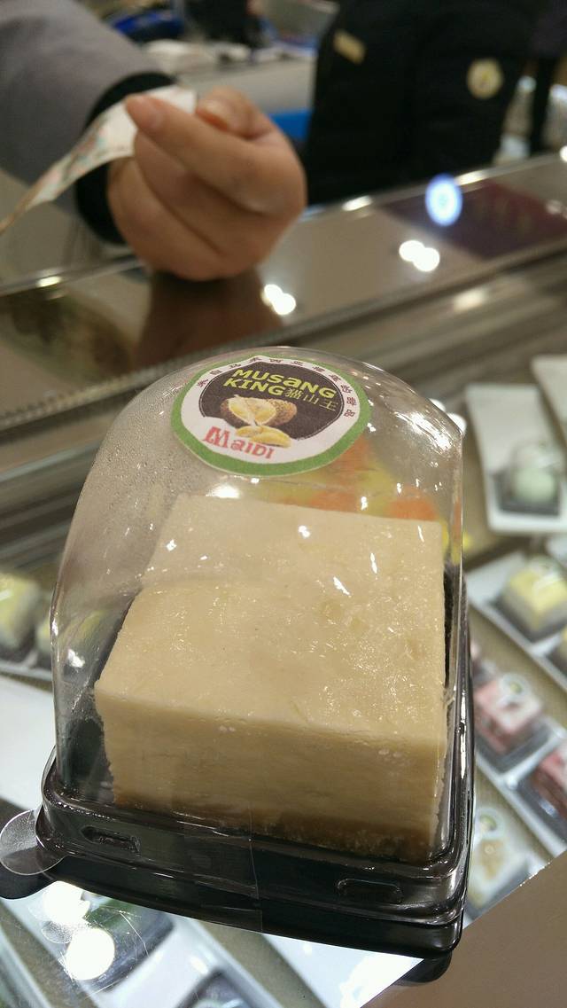 在凯司令的柜台上现吃的榴莲芝士。。味道还是不错的,有榴莲肉,就是太甜了,多吃两口齁死。底下饼干底硬邦邦的。18块