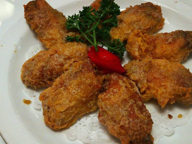 蛋黄炸鸡翅。其实我吃鸡翅都会把皮撕掉的,吃这种就很矛盾,好吃的就是皮上的蛋黄,但是油又很多。。