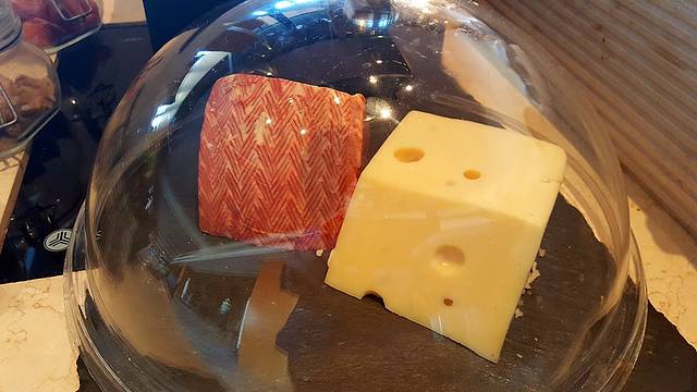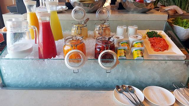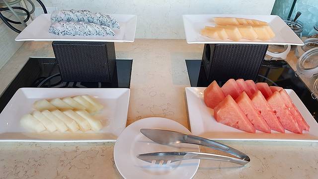 作为个吃货,早餐自然是考量酒店优劣的重中之重,俗话说过:早餐吃得好,一天没烦恼。在行政楼层中,每一层都有其自己的行政走廊,无需再搭乘电梯到其他的楼层进餐,只需要稍移几步就可以品尝的新鲜的早餐。大概是因为在淡季,整个的用餐过程中,包括我在内也不过三桌客人在用餐,相应的服务人员也只有一名。而究其菜品而言,新鲜度无可挑剔,新鲜榨制的果汁、刚刚出炉的牛角面包撒发出轻微的香气、敏感的三文鱼身上透着鲜亮的光泽、新摘下的蔬菜被有序的放置在各自的玻璃罐中,不仅方便取用,也极具美感。稍感美中不足的是,作为经常需要取用的干酪,并没有预先切片备用,整块放置在餐托上,不便于食用。;另一点则是相对而言食材的种类稍少了一些,几乎全部都是以西式的餐食,如果遇到更忠于中式早餐的客人,可能会吃得不太够尽兴,不知道其他的楼层中是否也会出现这样的情况。