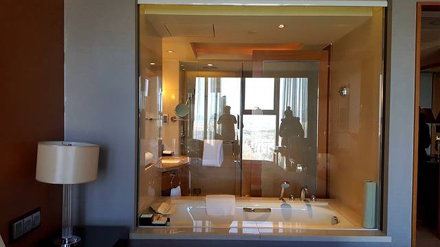 房间内设施中规中矩,虽不能说上一应俱全,但是依旧无愧于五星级的标准。浴室内不仅准备有常用的沐浴液、护发素、洗发液和肥皂四大标配,还为对生活更为考究的客人准备了浴盐与香体精油,可圈可点。浴室内所有的镜面,包括水龙头与花洒等不锈钢表面都没有可见的水渍,这一点也非常难得,尤其是在搭放浴巾的不锈钢挂杆这样的死角,也同样不见丝毫水渍。