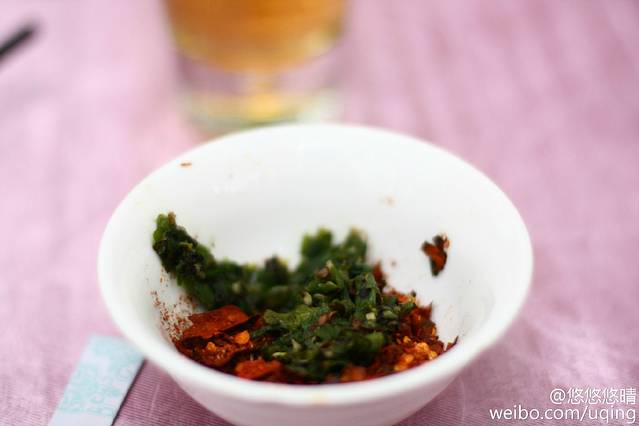 酸汤鱼的蘸料在贵州黔东南叫蘸水。连这蘸水都是大有讲究,蘸水也就是蘸料,里面除了烤制的辣椒碎外还配了很多别的香料,既可以浇入锅里的热汤,就像油辣椒一样香气扑鼻,也可以干蘸,吃起来很香。一路上吃了很多的蘸水,每家店还都有些不同,体现着不同的风格。有的还放了折耳根、蒜泥、香菜、香葱碎、捣碎的香草等材料。